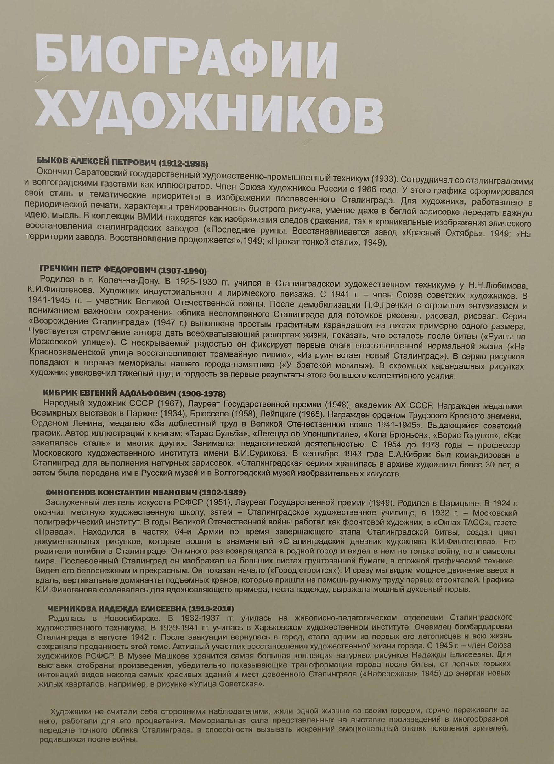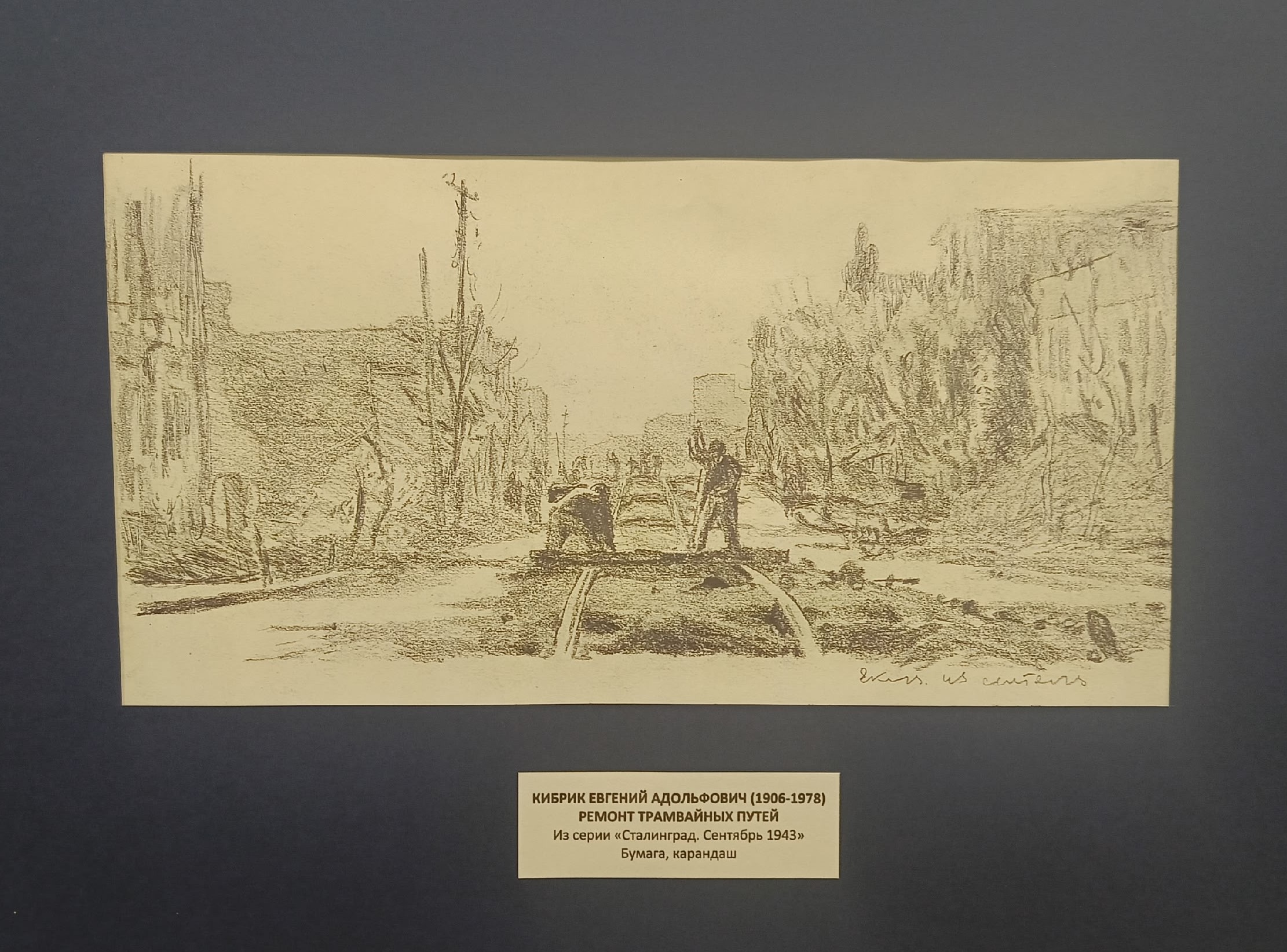 На выставке представлено 20 рисунков и эстампов 5 художников, жизнь которых в большей или меньшей степени была связана со Сталинградом. Это Е.А. Кибрик, К.И. Финогенов, Н.Е. Черникова, А.П. Быков, П.Ф. Гречкин. Камерная выставка дает возможность в малом пространстве зала близко и вдумчиво общаться с авторскими зарисовками 1940-х годов.